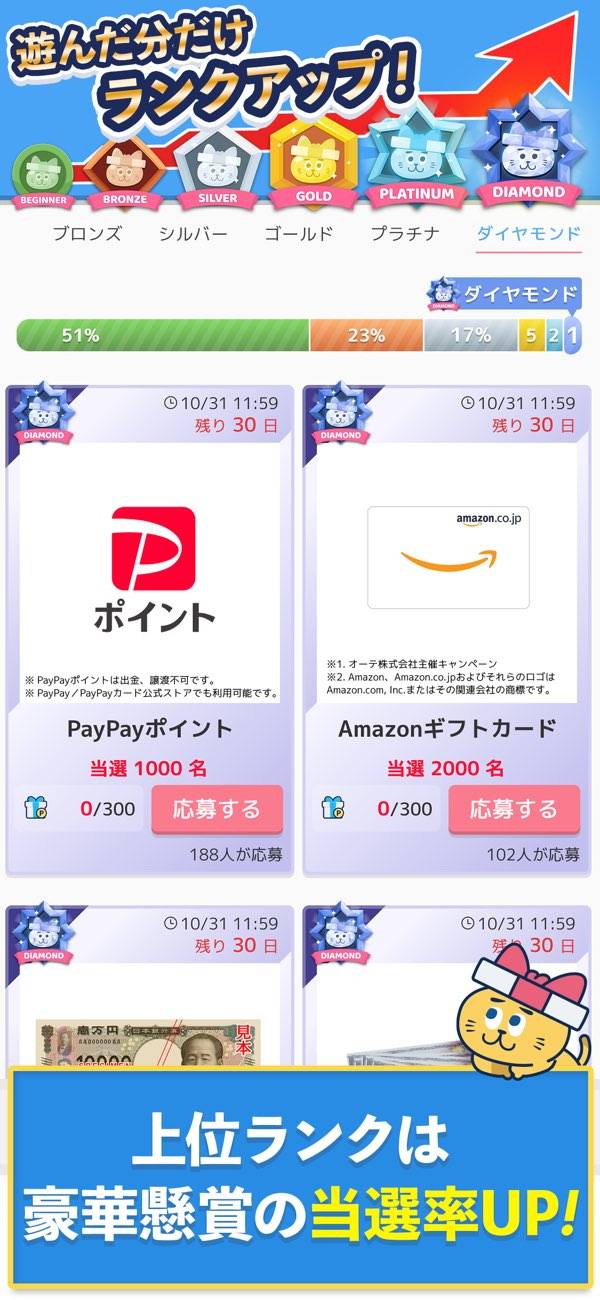 ステージクリアや動画広告視聴でもらえるポイントで抽選に応募。ドリンクチケット、ギフト券、お菓子や日用品などさまざまです。応募数が多いほど当選確率が高くなるので、欲しい商品を集中的に狙うのがおすすめ。