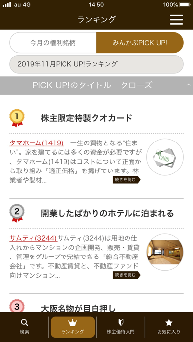 - 株主優待の人気ランキングをチェック可能。今人気の株がわかる