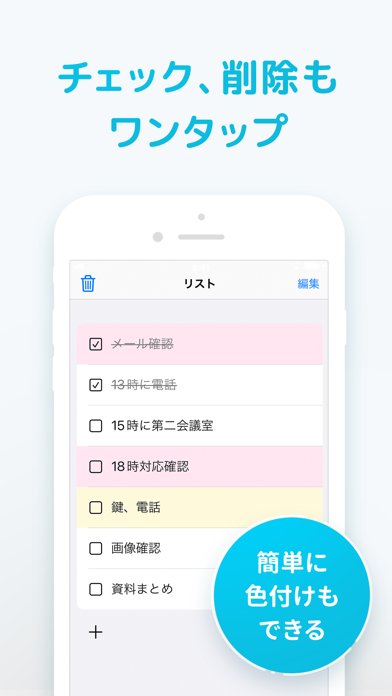 1画面ですべての動作が完了するアプリです。やることを入力して追加でき、チェックをつけて完了。色分けができるので、緊急度別に分けたり、仕事のタスクと個人的なタスクを分けたりできます。多機能すぎるアプリは使いにくいという人にピッタリです。
