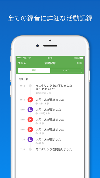 少しの物音でもすぐに通知が届く高感度マイク機能が搭載されており、夜間や留守中の見守りにもぴったり。録音された音をあとから確認することもでき、赤ちゃんの睡眠パターンの把握にも役立ちます。