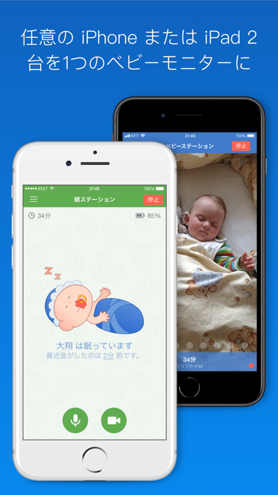 ベビーベッドの近くに1台のスマホを設置し、手元のスマホと接続するだけ。Wi-Fiだけでなくモバイル通信でもつながるので、自宅はもちろん外出中でも赤ちゃんの姿をHD映像とクリアな音声で確認できます。