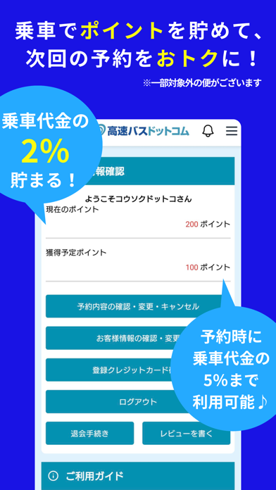 乗車代金の2%がポイントとして貯められる機能を搭載。1ポイント1円で、乗車日の2日後にゲットできます。貯まったポイントはバスの乗車料金の支払い(最大料金の5%)に使えるので、本サービスを使えば使うほどお得です。