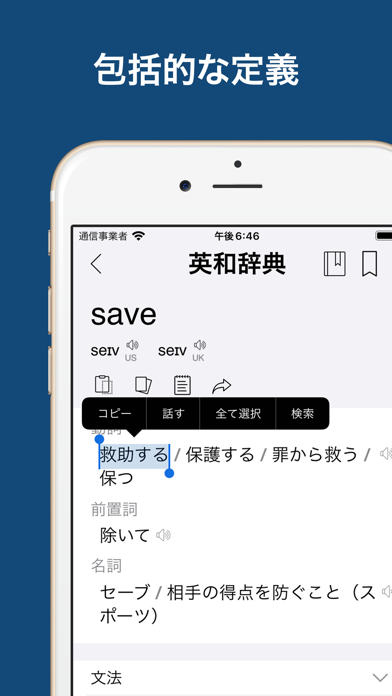 単語ごとに英語解説と例文を確認することが可能です。解説は、日本語訳や文法・例文など、かなり詳細に記載されています。単語の意味だけでなく、その単語が実際にどのように使われるのかを知ることができるので、実用的な英語力を身につけられるでしょう。