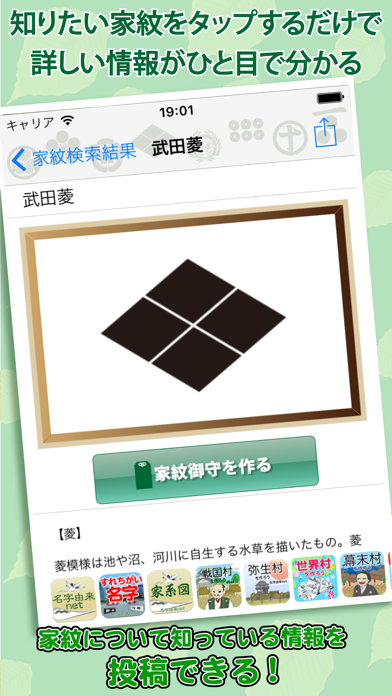 さまざまな家紋が検索できるアプリ。自分の家の家紋や有名武将の家紋まで色々載っています。家紋の由来を他ユーザーが教えてくれたり、とても勉強になります。