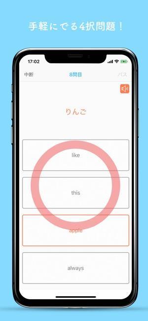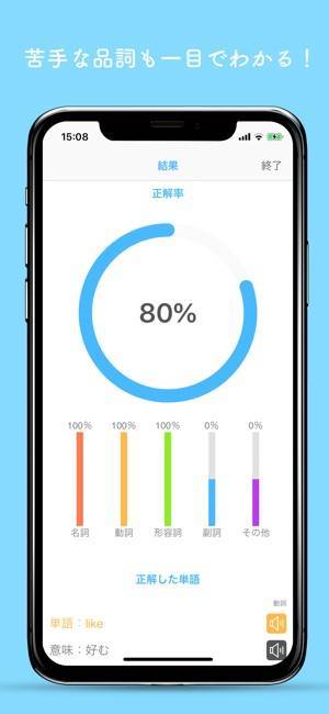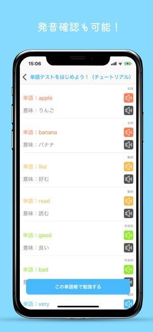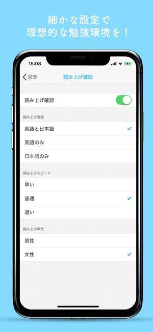 単語帳に登録した英単語から4択クイズを出題してくれます。何度もチャレンジして満点目指して頑張りましょう。読み上げ機能もあるので、リスニング力強化にもつなげられます。