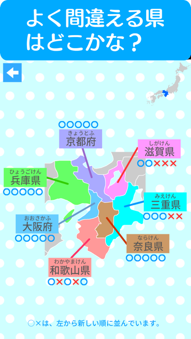 ▲”関東”や”近畿”など6つのエリアに分けて、少しずつ47都道府県の位置を学習していける。