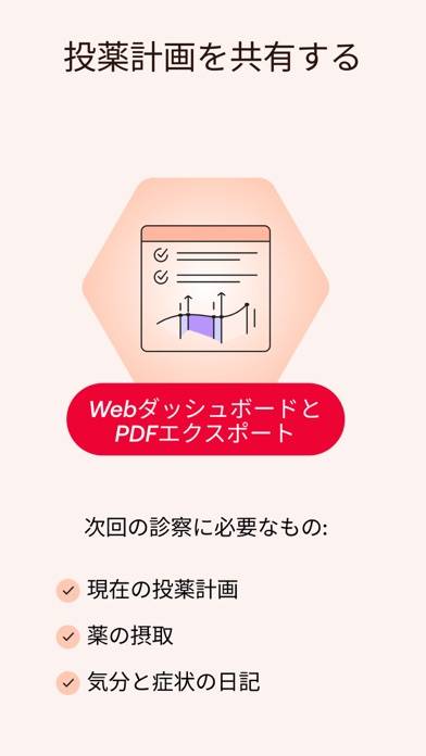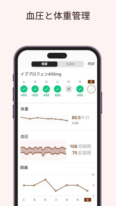 また、本アプリでは、体重や血圧などの健康状態を記録し、状況を視覚的に把握できる機能も。これらの情報をもとにヘルスレポートを作成し、医師や薬剤師と共有することも可能です。