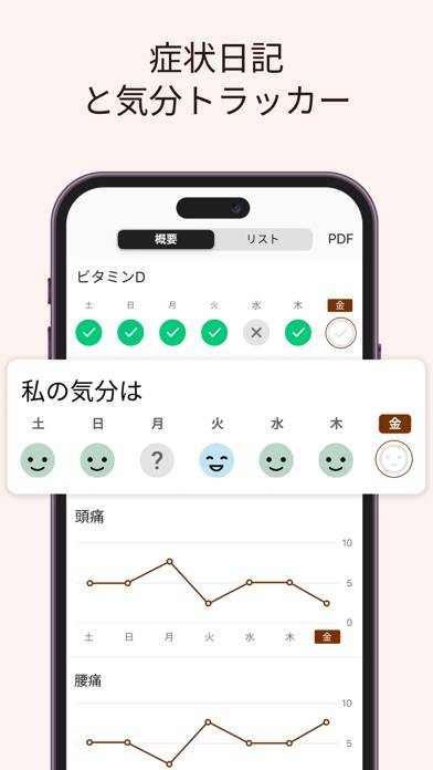 アプリでは血圧や体重、心拍数などの測定値を記録し、日々の健康状態を追跡できます。また、症状や気分もチェック可能。これにより、健康状態の変化を視覚的に把握しやすくなり、早期に問題を察知し対応することができるようになります。
