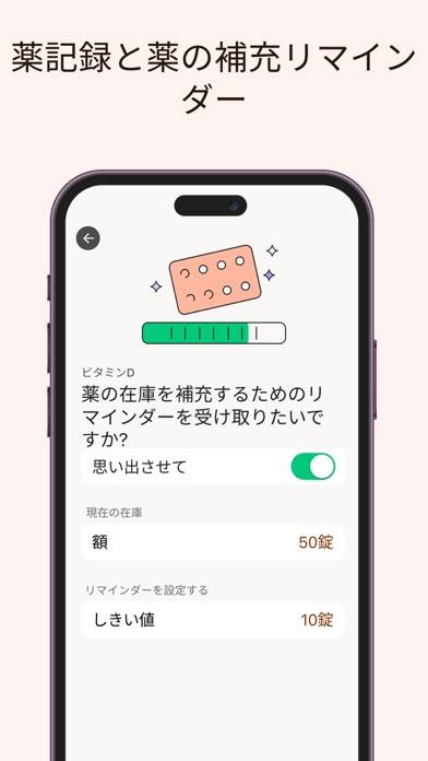 - 服用時間だけでなく、補充通知の設定もできる