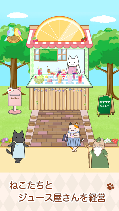 ゆるーい猫たちが経営するジュース屋さんを手伝って、どんどん売り上げを稼ごう!という感じのアプリ。