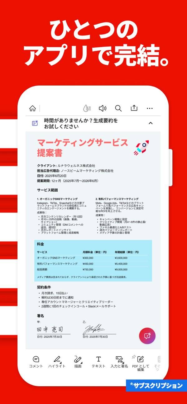 外出先でもスマホからPDFの閲覧、注釈、署名、共有までがまとめて進むツールです。音声やテキストで質問する要約・質問機能や、ページの整理、形式変換なども一通り対応。出先でも「確認して返す」「直して送り直す」が迷わず終わるので、移動時間でも仕事が進みます。