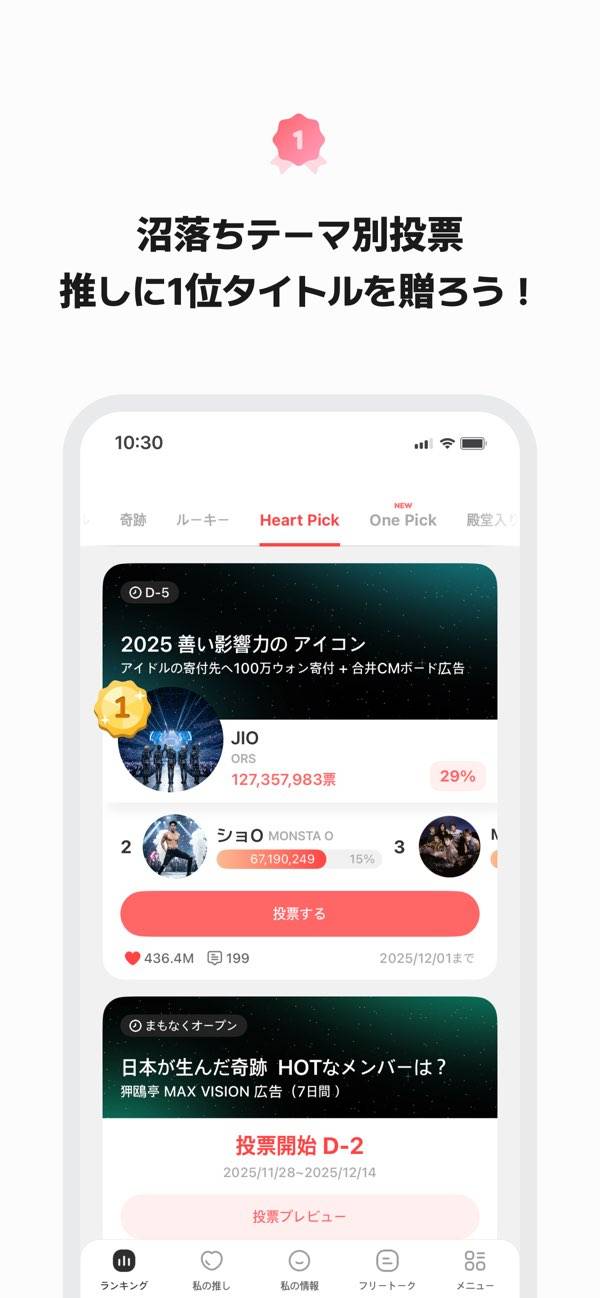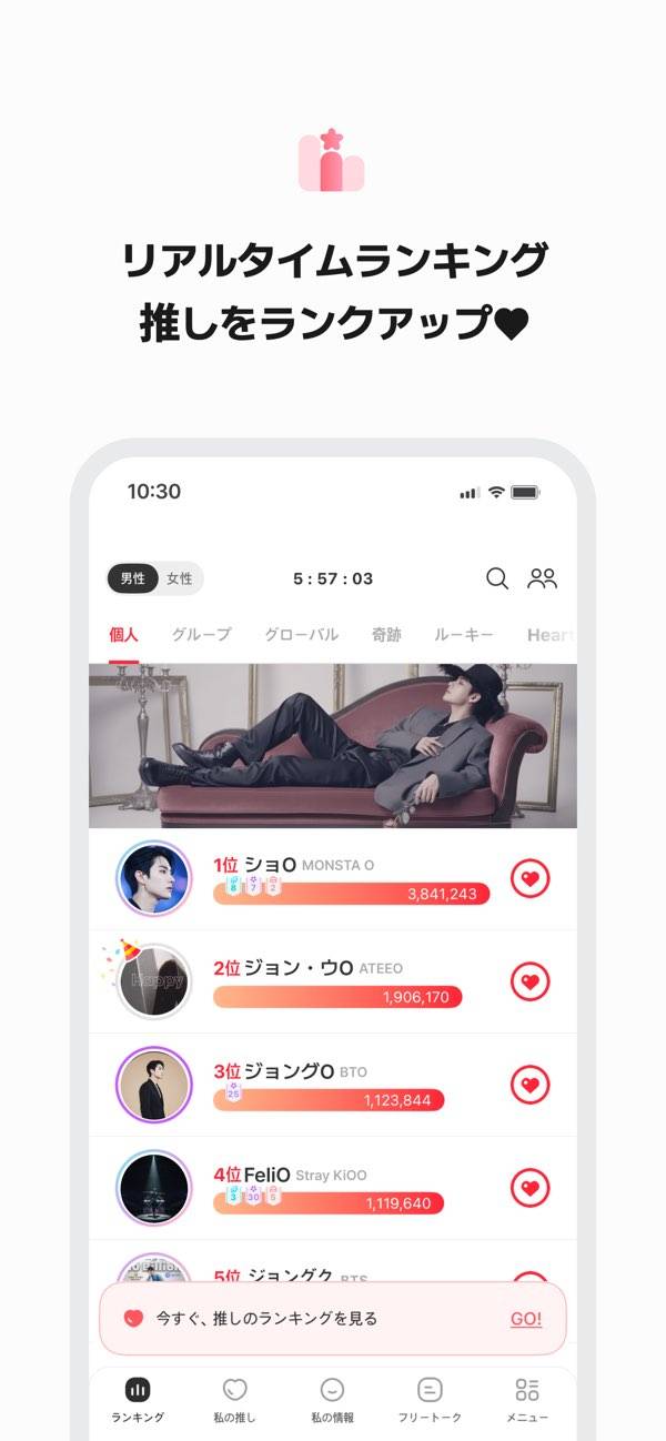 男性・女性問わず、韓国アイドルグループが連なるランキングアプリです。ハートを送って推しを応援したり、グループ活動をスケジュールでチェックしたりと多機能。推し活がもっと快適になるでしょう。ほかファンと熱意を語り合う掲示板も用意してありますよ。