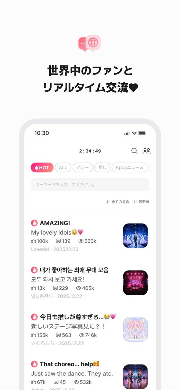グループごとの投稿ページがあり、SNSのように楽しめます。毎日ファンたちが推しグループに関するつぶやきや画像を自由に投稿。大勢と盛り上がっているような気分になれます。