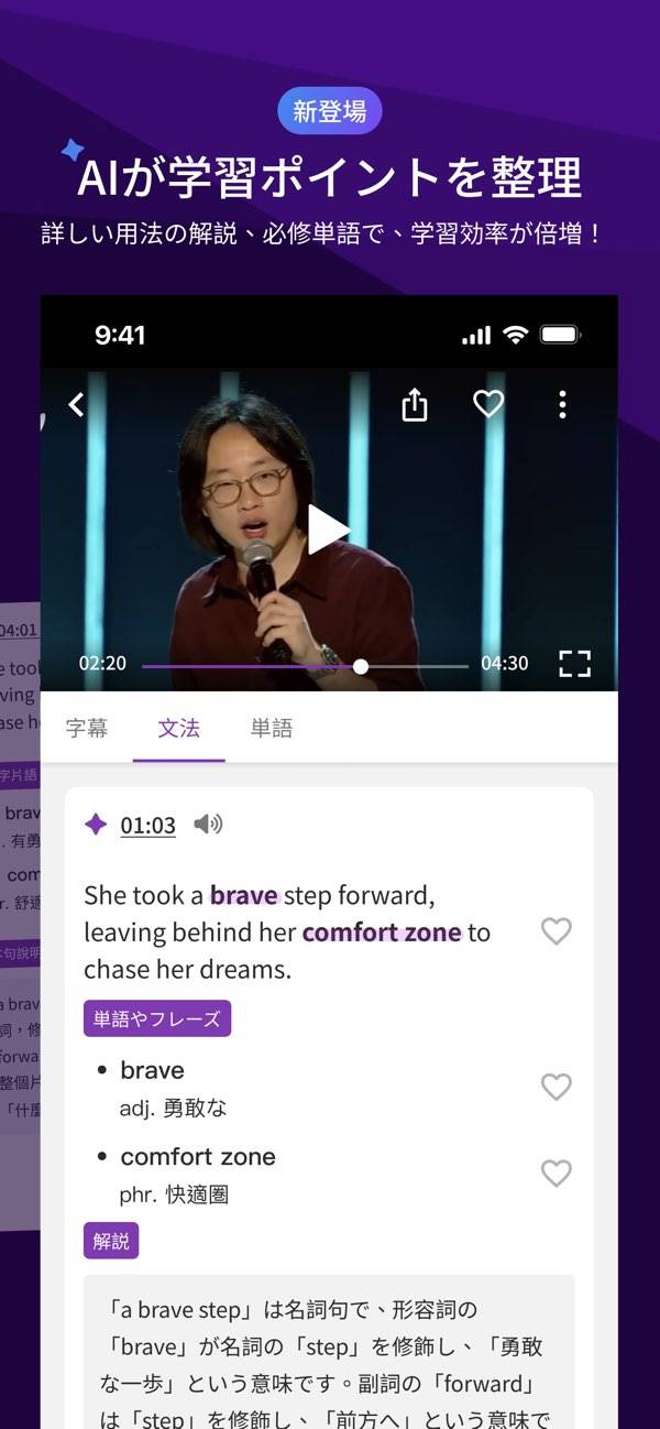 動画の中の英語について質問がある場合、英語または日本語でAIにいつでも質問できます。
