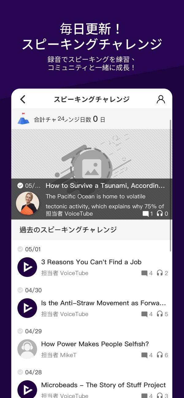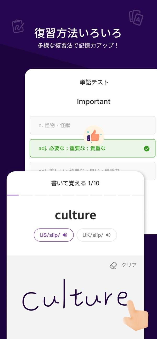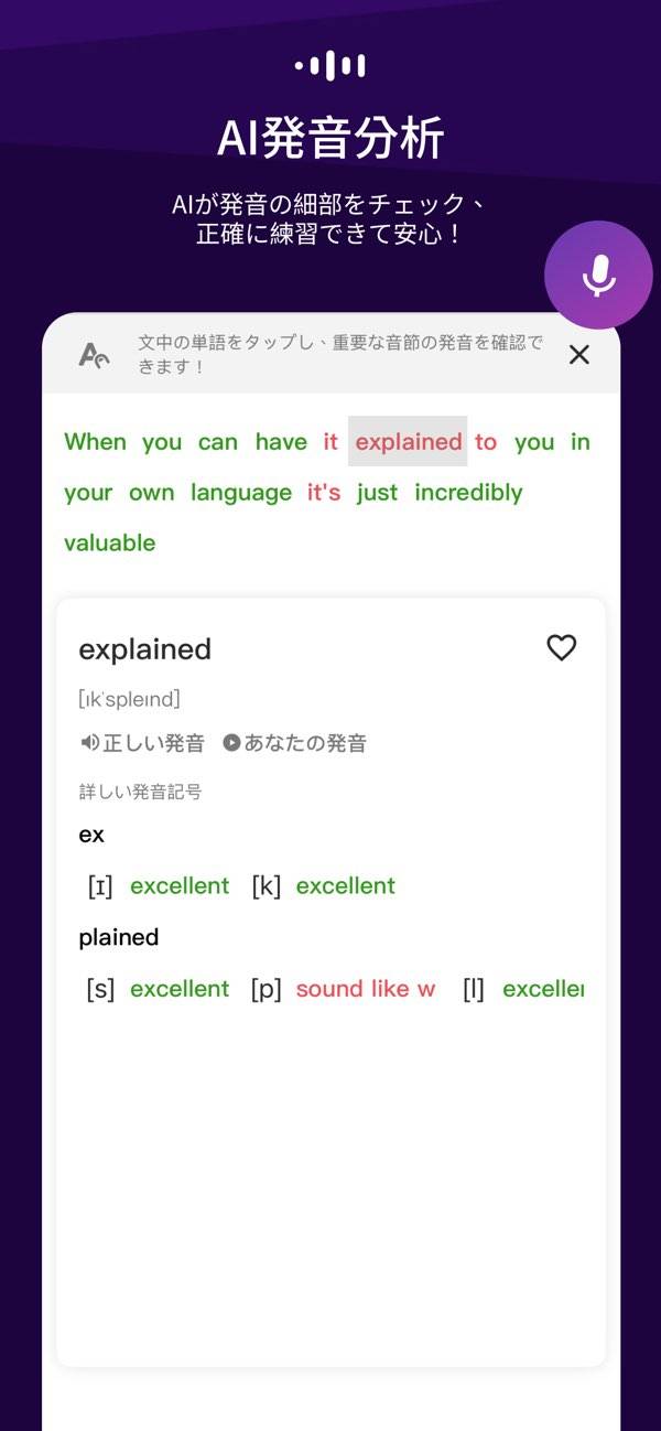 シャドーイング機能もあり、効率よく発音練習ができますよ。