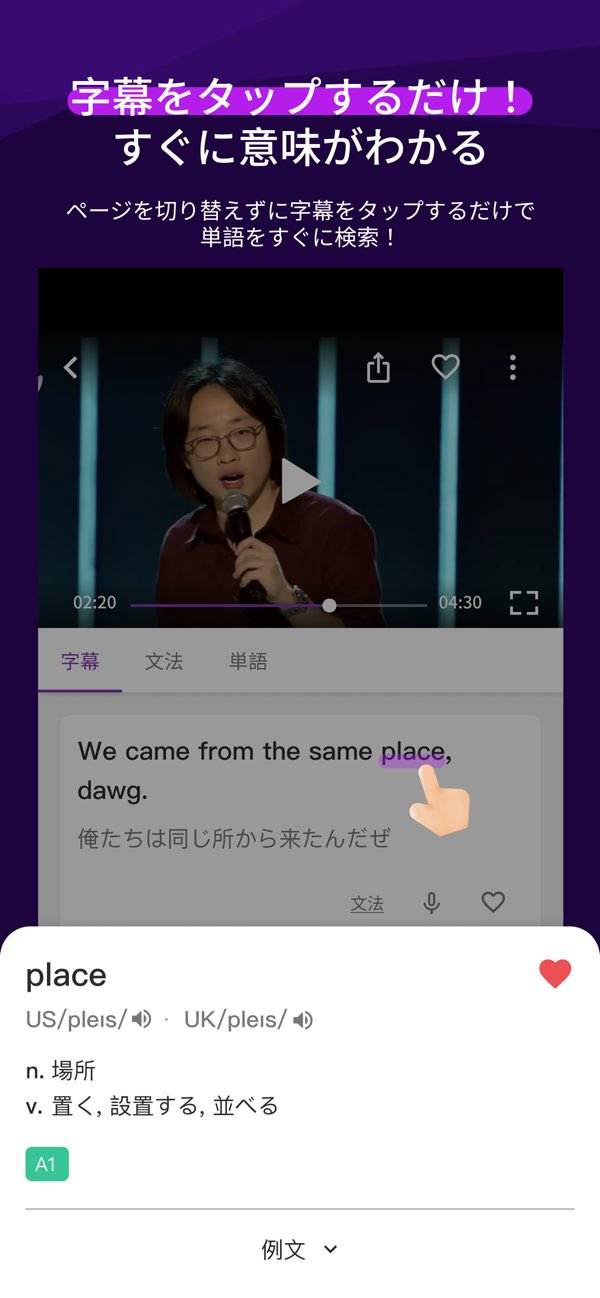 - シャドーイング機能を搭載。字幕と音声から発音練習ができる
