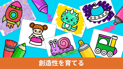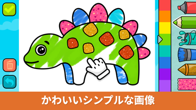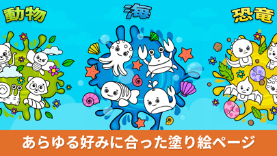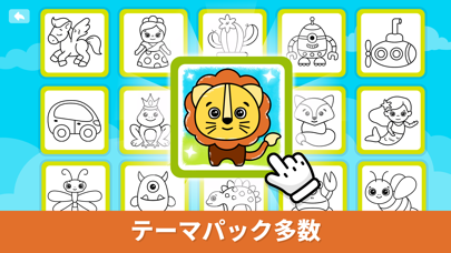 好きな色で塗るだけのかんたん操作。どうぶつや乗り物など、11のテーマパックにわかれていて、いろんなジャンルの絵が楽しめます。カラーパレットから色をタップするだけでぬれるので、2歳ごろなど小さな子供も迷わず始められます。色を自由に選ぶことで、発想力や感性が自然と育ちますよ。