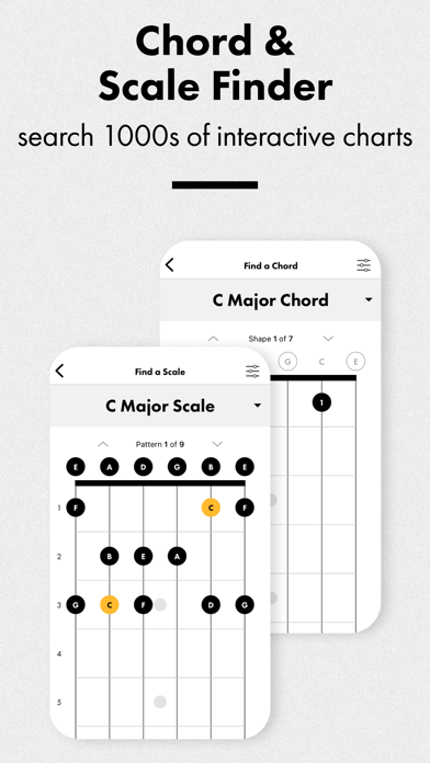 - 有名曲のコードやタブ譜を見られる機能はほかアプリが必須
