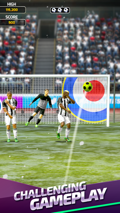 フリック操作で、ボールのコースを自由自在に打ち分ける事ができます。本アプリでは、ただゴールを狙うだけではありません。動く的を狙ったり、時にはクロスバーを狙ったり、様々なお題にチャレンジすることになります。