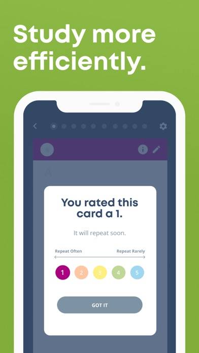 質問と回答のペア形式のフラッシュカードが提示され、しっかりと記憶に定着。また、ユーザー自身が各概念の理解度を5段階で評価し、それに基づいてフラッシュカードの再提示間隔が調整されます。適度な頻度で反復練習ができ、学習がはかどります。