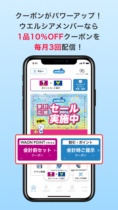 クーポンがもらえたり、毎日引けるくじがありウエルシアファンには欠かせないアプリです。20日3割引はどこのドラッグストアにもなサービスで嬉しいです。