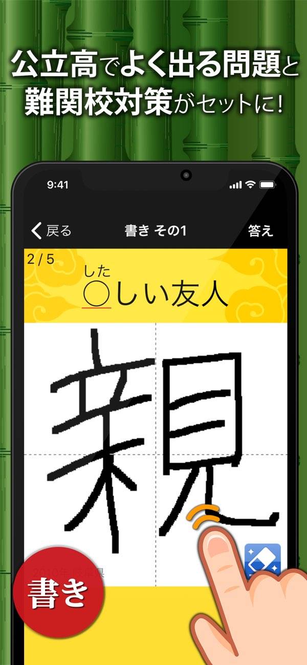 高校入試対策に最適な漢字学習アプリ。手書きで漢字の書き方をマスターできます。10問ずつ出題されるので、通学時などの空いた時間にささっと勉強できます。難易度別になっており、自分に合ったレベルの勉強ができます。認識精度も調整ができ、3段階の認識精度を選べます。