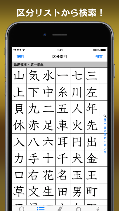 - 手書き、キーボード、部首索引、読み索引など、常用漢字をさまざまな方法で検索