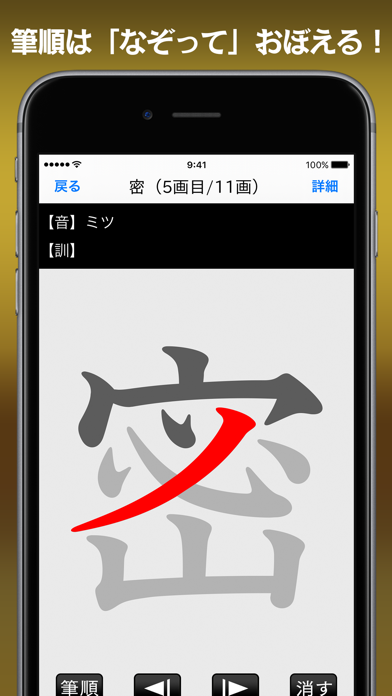 常用漢字の読み方と書き順が収録された辞典アプリです。筆順をアニメーションで表示しており、お手本をなぞって練習できます。