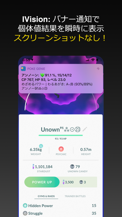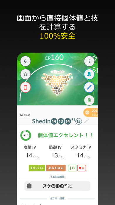 捕まえたポケモンの個体値を計算し、評価を表示してくれます。強いポケモンかどうかを判断してから育てられるので、効率的な育成が可能になるでしょう。個体値の計算はスクリーンショットを読み込むかたちで行います。