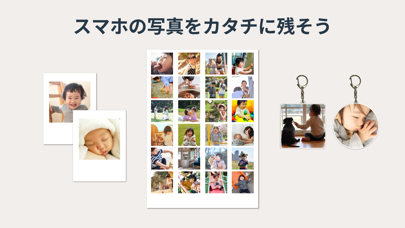 スマホ内の写真からシールなどのグッズを有料で作れるアプリ。グッズは大型のスクエアシール・小さなシールのシート・キーホルダーの3種類から選べます。使う写真は複数選べるほか、形状などのオプションも選択可能。できあがったグッズは注文完了後、自宅に届けてもらえます。