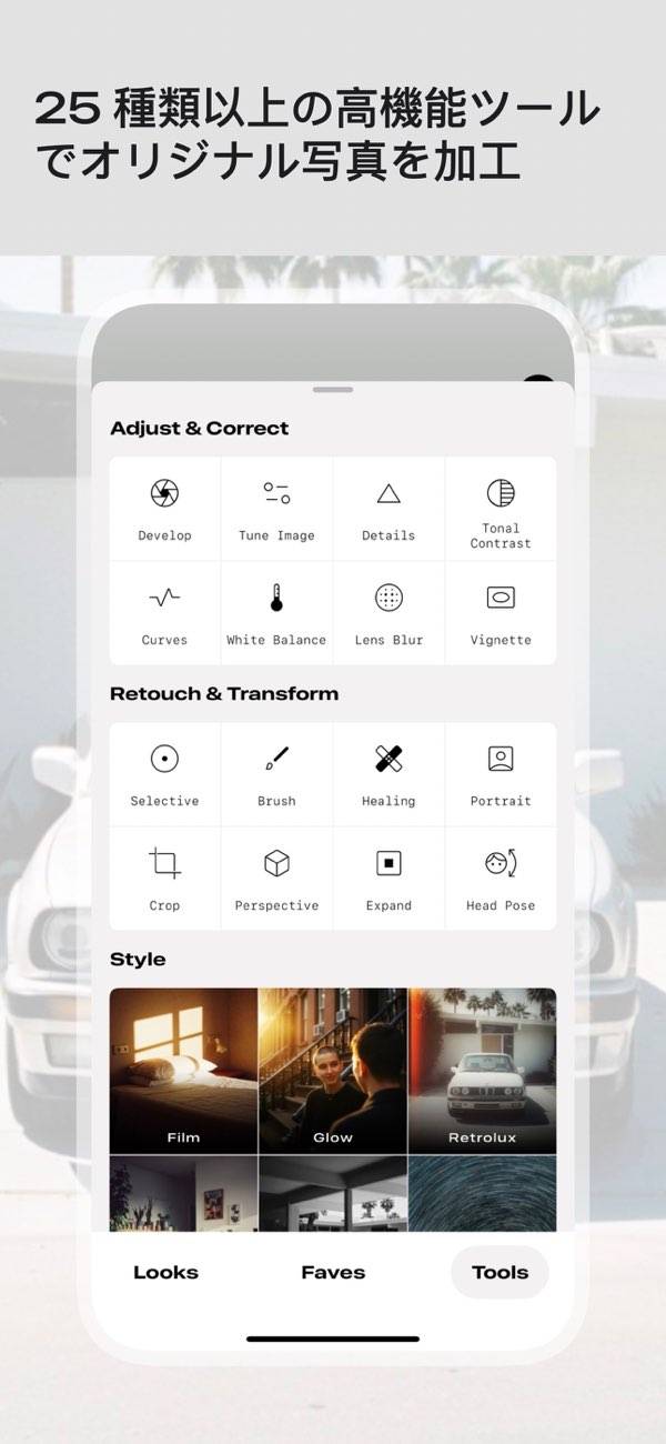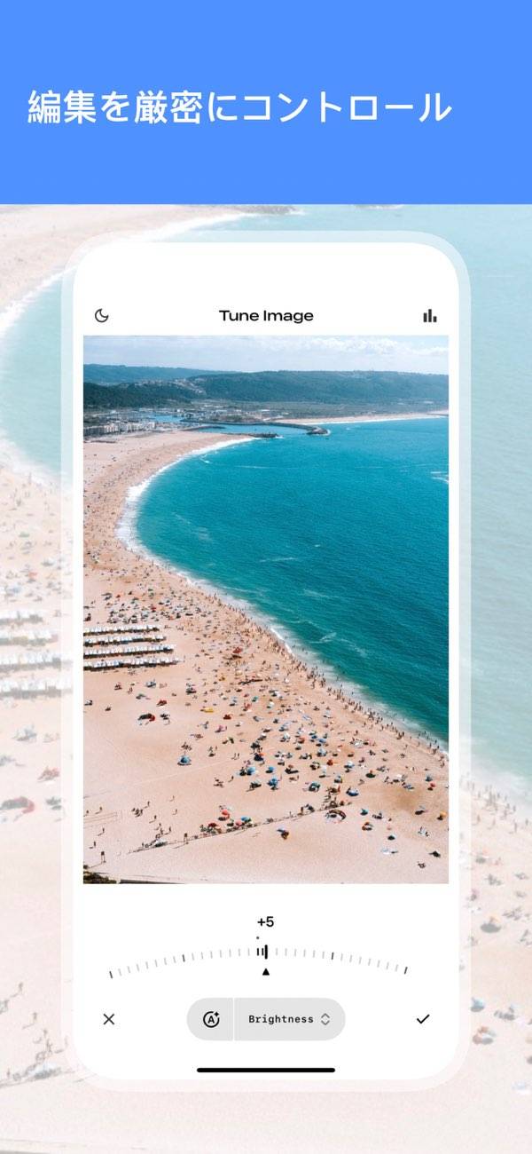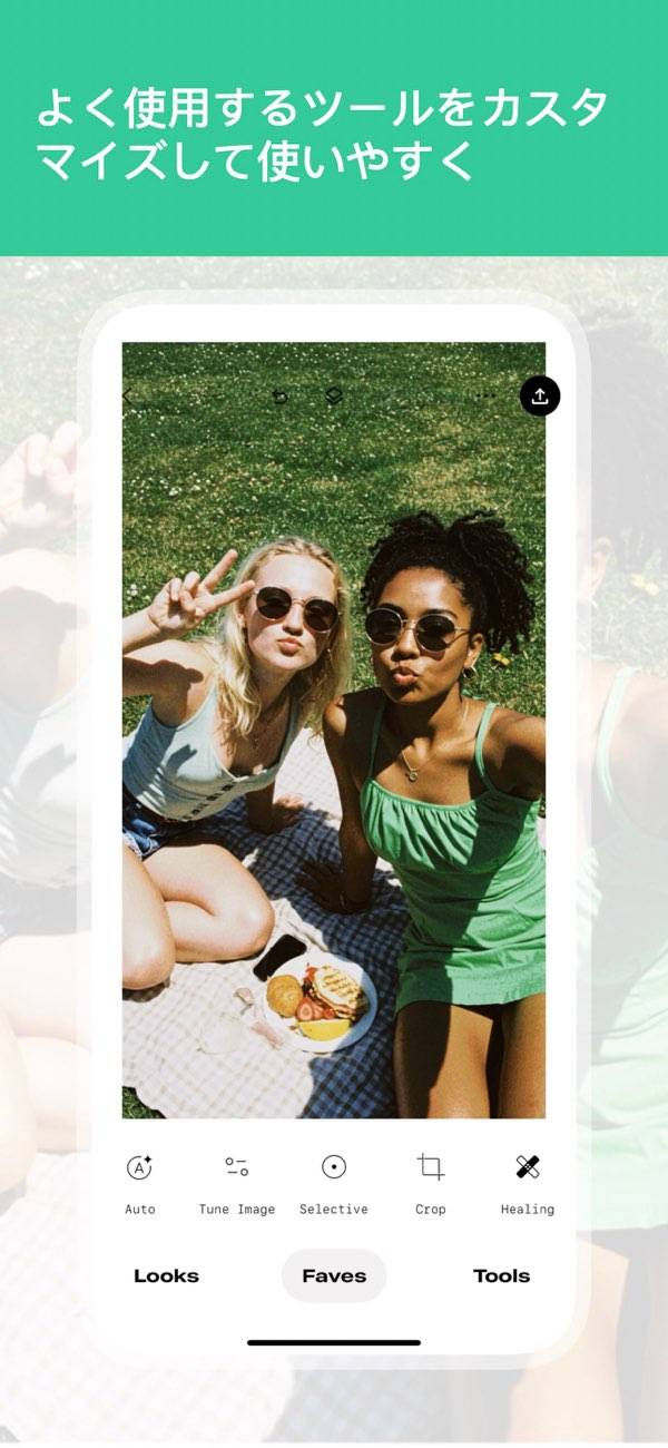 本格的な編集ができる写真加工アプリです。露出補正や色調整はもちろん、不要な写り込みを消せるシミ除去や傾き修正など、25種類以上のツールを収録。RAWファイルにも対応しており、撮ったままのクオリティで加工できます。広告表示が一切ないので集中して作業できるのもうれしいポイントです。