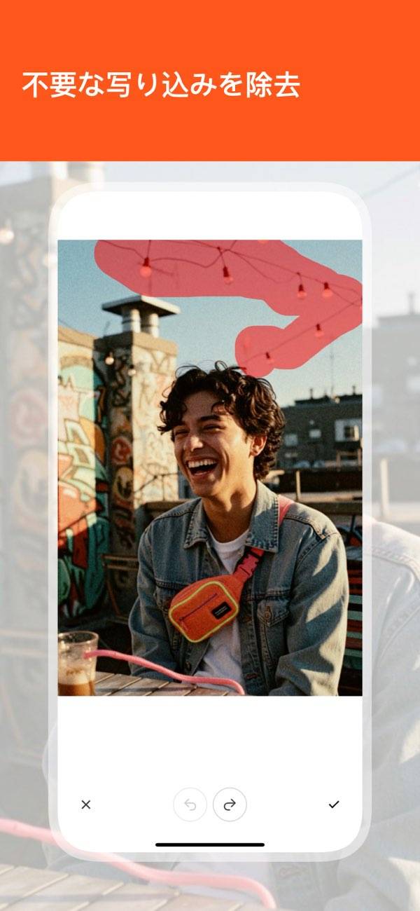 複雑な背景に入り込んだ人や影を自然に消去できます。操作は簡単で、消したい部分をなぞるだけ。写真の中で目立たせたくない要素を瞬時に消せるため、旅行写真やポートレートの仕上がりをグッと良くできます。細かく選択できるので、人物の髪や背景の模様にも対応可能です。