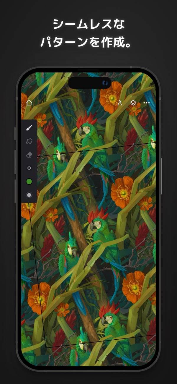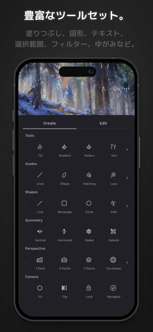 シンメトリーパターンや歪みなど、変形ツールを使った細やかな調整が可能。線が少し曲がっていいても自動で補正。モバイル上でプロフェッショナルな作品を生み出せます。これらの効果により、創作活動がこれまで以上に自由で効率的になります。