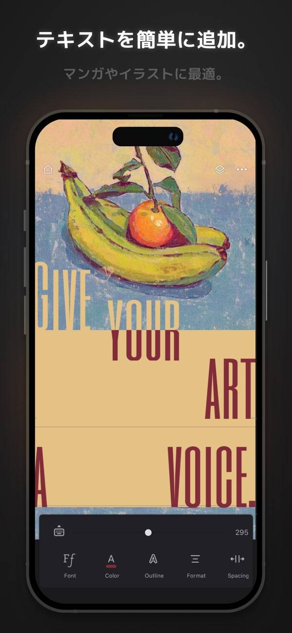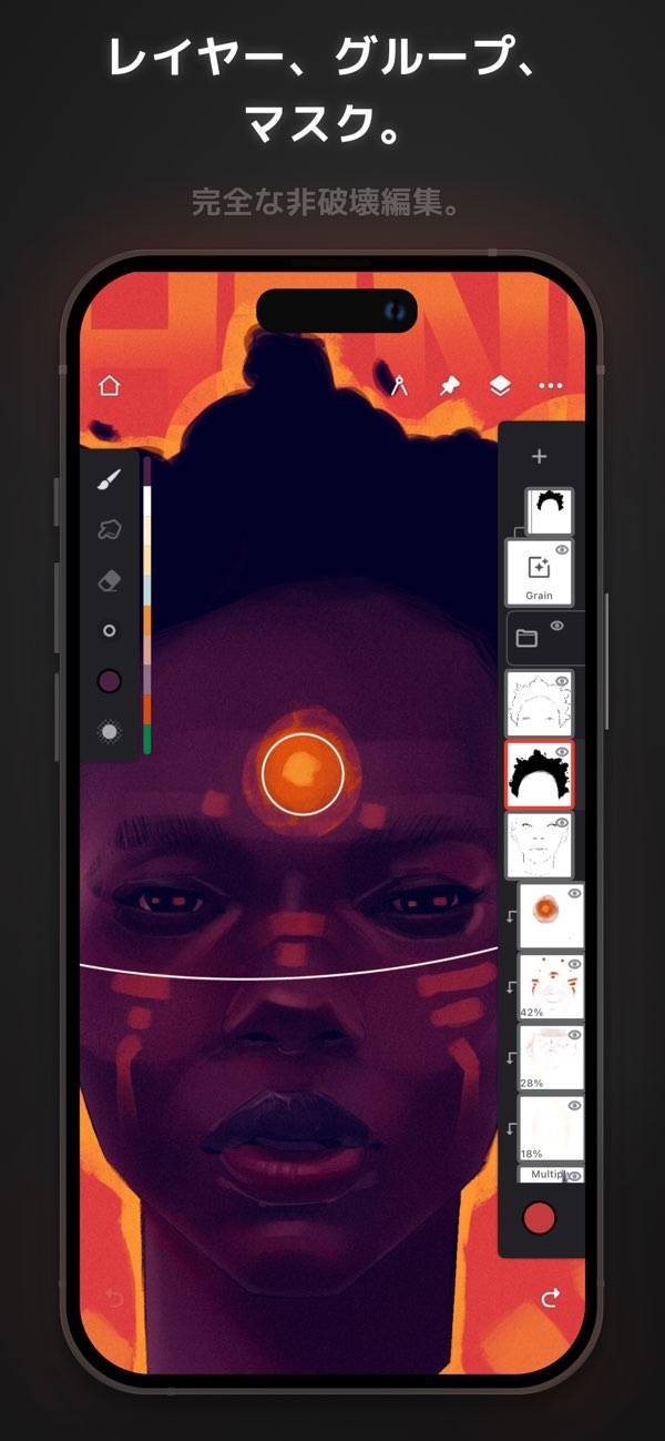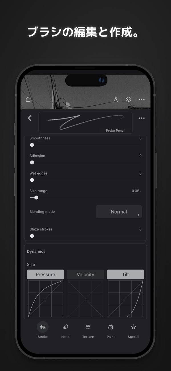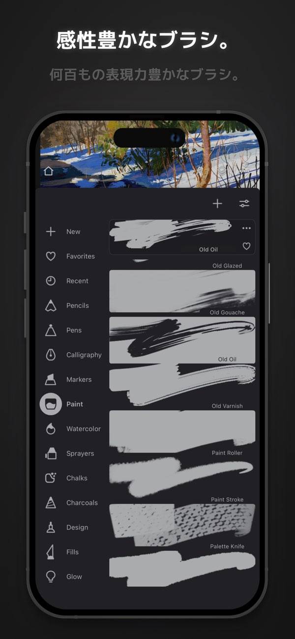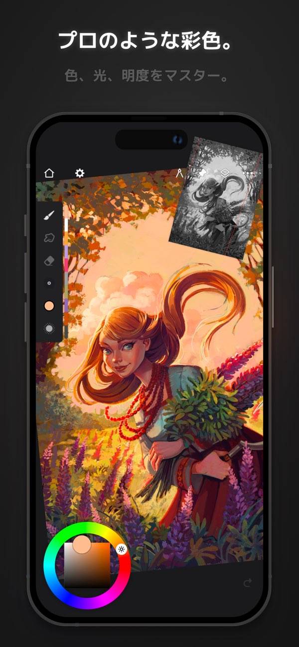 豊富なブラシプリセットを搭載し、それらを自由にカスタマイズ。テクスチャを活かした繊細なタッチで、絵筆の感触をスマホ上に再現。細かな設定が可能で独自のブラシを作り出せます。アート作品に深みと個性が生まれます。