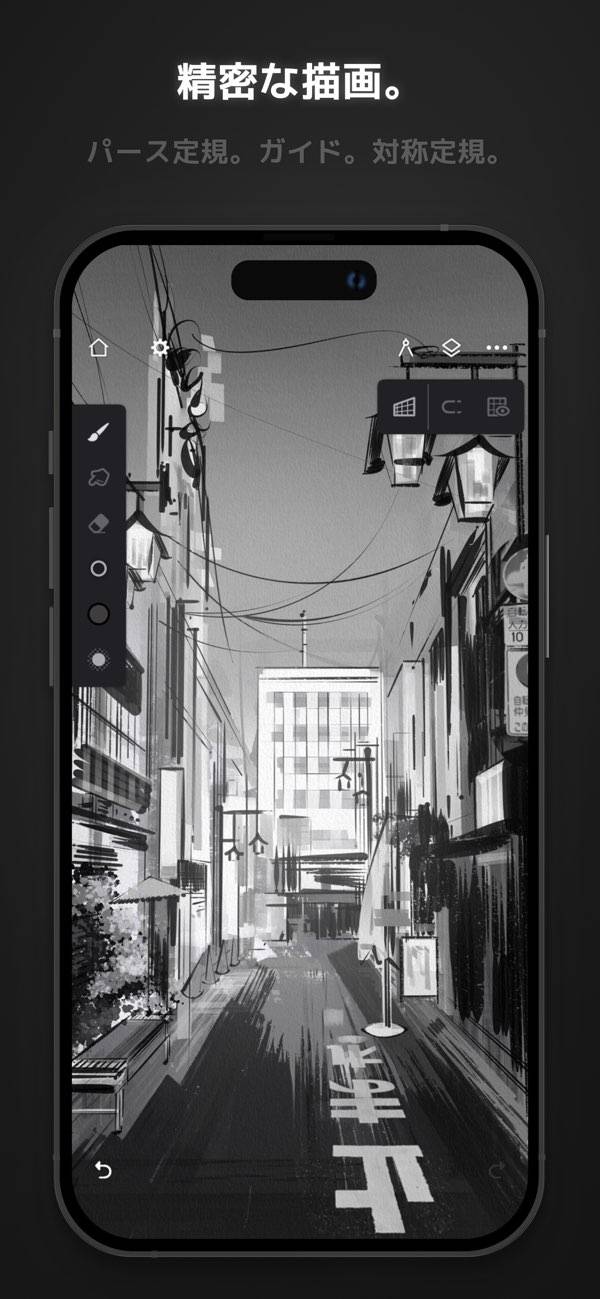 パースペクティブガイドや対称性ツールを駆使して、立体的な作品が書けます。3Dの都市風景を描く際のガイドや、対称的なデザインを駆使して正確に描写。思い描いたシーンを画面に落とし込めます。