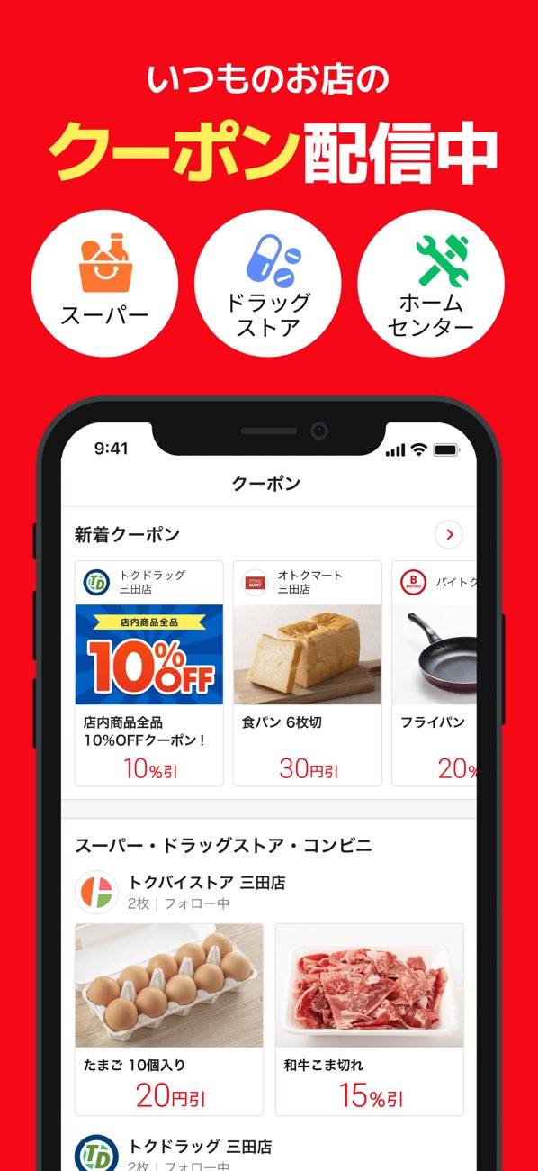 よく利用するスーパーのクーポンがこのアプリで配信されるのでダウンロード。