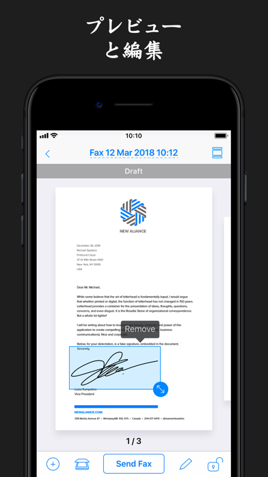 スマホから直接FAXを送信できるアプリです。使い方は簡単。送信したいデータを用意し、自分と相手の電話番号を入力して、送信すればOK。データの送信は有料ですが、スキャンするときにノイズ除去ができるなど、高画質なデータを送信できるのが特徴です。