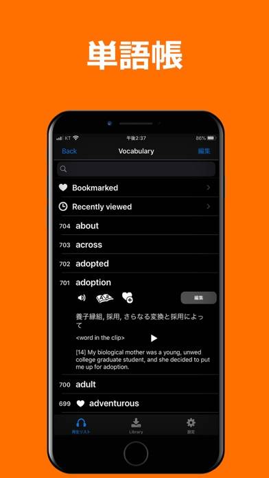 あなたの英語リスニング力を向上させるのに最適なアプリです。豊富な音声教材を収録、映画から童話まで興味に合わせて学習できます。再生速度の調節や区間リピートなど、効率的な学習をサポートする機能も充実。自動単語抽出やブックマーク機能で、新しい単語の学習や特定部分の反復練習も可能です。