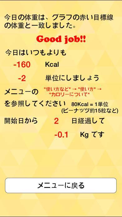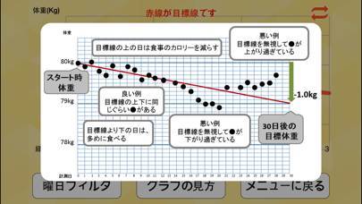 目標線が右下がりがよいですね。他の体重管理アプリは、目標線が水平のものしかありません。特許登録済みの方法なので、間違いないと思います。