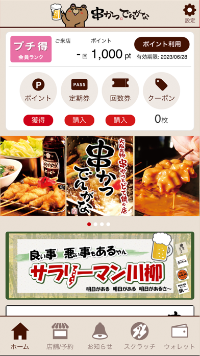 「串かつ でんがな」のほか、「鉄板酒場 鐵一」や「焼きとん あさちゃん」、「ワインバル ダイナーBACHI」といった系列店で利用できます。どの店舗でも共通でポイントを貯め、値引きができるので、これらのお店によく行く方は必携。QRコードを読み取るだけと、毎回手間なくポイントがもらえますよ。