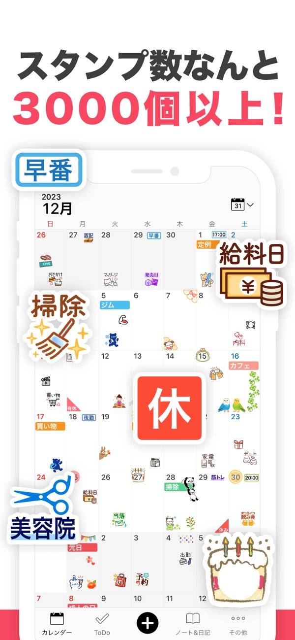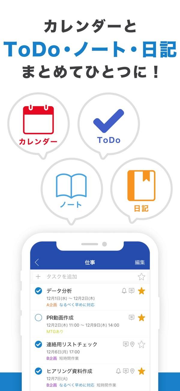 カレンダー、ToDoリスト、ノート、日記がひとつになった便利なスケジュール管理アプリ。月・週・日などの表示切りかえや色分け、スタンプなどの機能も充実しています。手帳感覚で気軽に使えて、予定とやることをまとめて管理できるのがうれしいポイントです。