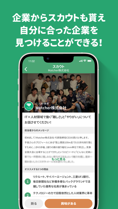 面倒な手続きは必要なく、ワンタップで申し込めます。マッチングが成立したら、チャットを使って訪問日程の調整が可能。メールや電話でアポ取りする手間が省けるので、効率的な就活につながるでしょう。
