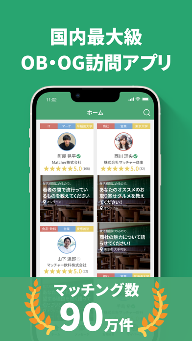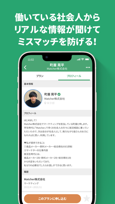 出身大学は関係なく、気になる企業の社会人を選んでマッチング可能。一流企業やベンチャー企業に加え、起業家など、多くの社会人が登録しています。マッチング率は70%を超えており、就活に有力な情報を集めたい人にぴったりです。