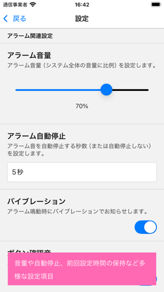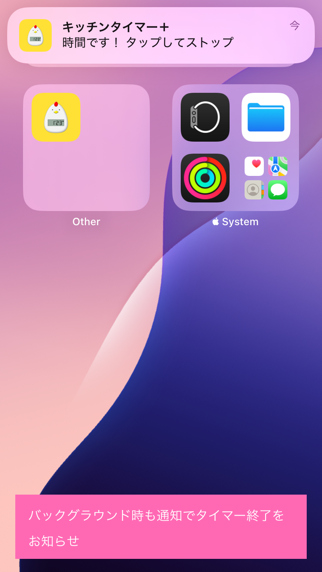 タイマーはバックグラウンドでも進みます。時間になったらアラーム音と振動で知らせるので、目を離していても安心です。「今何分経ったっけ?」と忘れがちな料理中の強い味方になります。