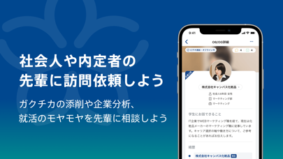 自分の大学の卒業生と繋がれる就活アプリです。官公庁の職員から起業家まで業界の第一線で活躍する先輩と、オンラインで対話できます。また企業情報や就活体験記など、明日からの就職活動に役立つ情報が満載。