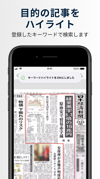 あらかじめキーワードを設定しておくと、該当する記事が紙面上でハイライトされて表示されます。たとえば「金利」「為替」「インフレ」などを登録しておけば、自分に関係する話題がすぐに見つかる仕組み。膨大な記事の中から、重要なニュースを簡単に見つけられます。