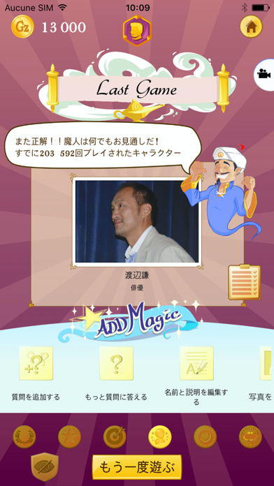 ▲思い浮かべた人物やキャラに対して、魔人の質問を答えるだけ。思い受かべたキャラを当てられたときは感動する。