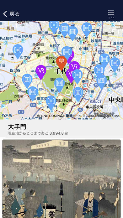 現在地図と古地図を切り替えて、古地図を見ながらの町歩きも◎。マップにあるVRマークをタップするとVRで当時の様子を再現し、巻物マークをタップすれば、史跡や寺社などの解説を見られます。