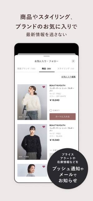 過去の購入履歴やお気に入り登録にもとづいて、ホーム画面に最適な情報が表示されます。購入したアイテムに合わせやすい商品や、スタッフのスタイリング提案など、一人ひとりに合わせた情報が届きます。自分に似合う商品がわかるので、買い物時に迷いません。