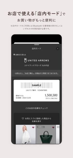 ユナイテッドアローズでのお買い物がお得に便利になるアプリです。カードレスでマイルが貯まる会員証機能に加え、店内での在庫確認やバーコードスキャンができる「店内モード」を搭載。さらに、一人ひとりの好みに合わせた商品提案で、オンラインでもリアル店舗でも快適なショッピングを楽しめます。